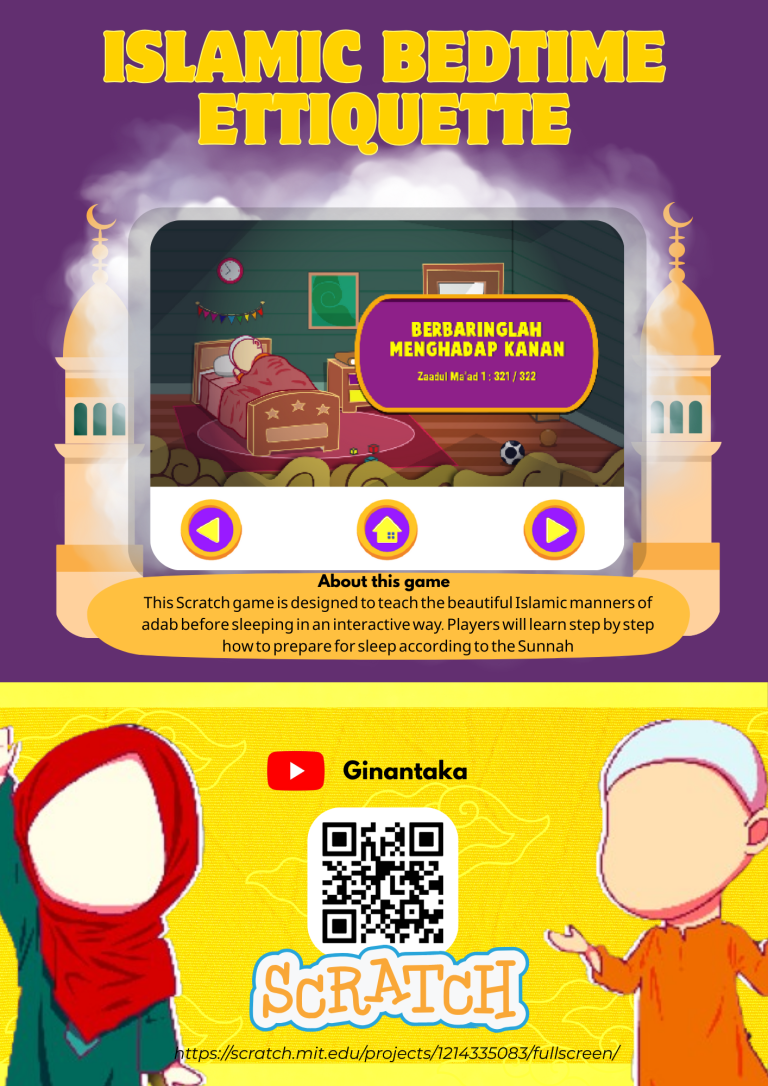In this game, you will be taught step by step how to follow the sunnah practiced by the Prophet’s companions before going to sleep. Starting from performing wudu before bed, cleaning the mattress first, sleeping on your right side, and reciting prayers. The hadiths are also included.